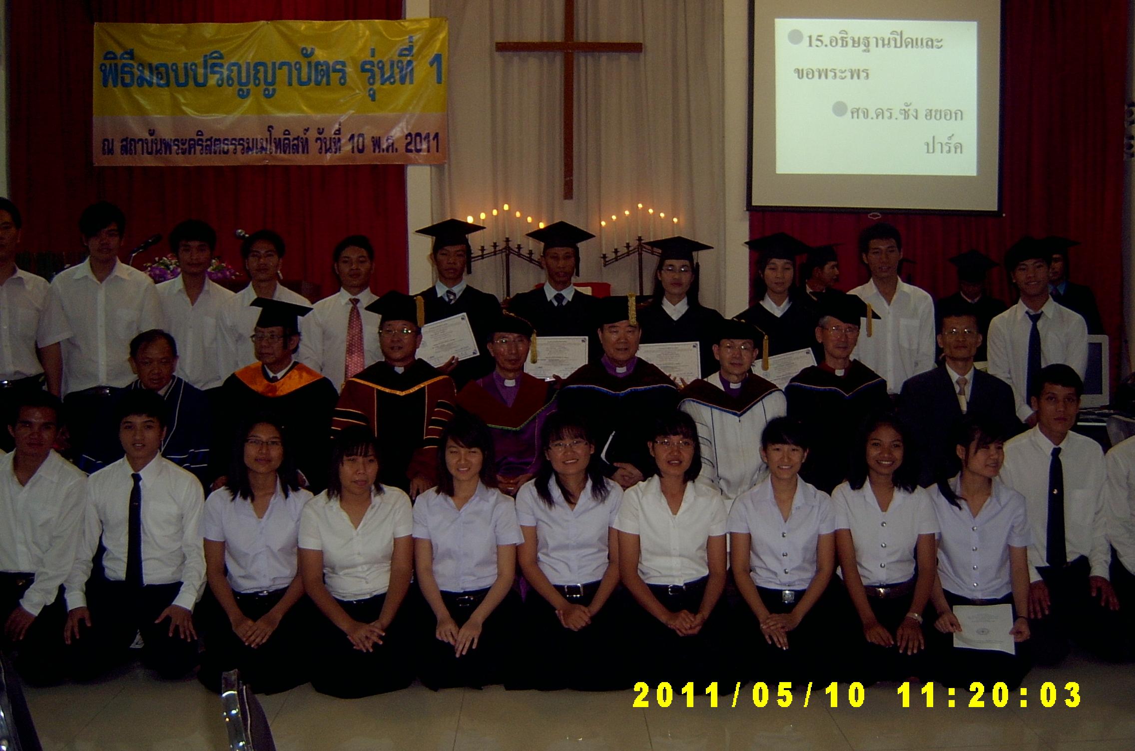 1)지난 2011년 5월 10일, 태국 감리교 신학교 제1회 학위수여식이 있었습니다. 학부 4년간의 학업을 마친 우리 신학생들 4명과 기존 감리교 목회자 4명(명예 학위 수여자) 총 8명이 학사 학위를 받았습니다.(사진-1) 목회 사역을 막 시작하는 전도사들에게 주의 성령이 함께 해 주시도록 기도해 주십시오. 4명의 졸업생 중 1명인 차이찬<냉>전도사를 태국 동북부 지역, 반파이 교회의 담임 전도사로 임명하였습니다.